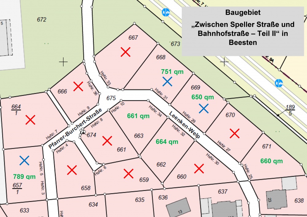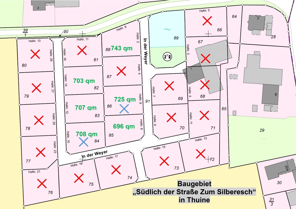 rotes Kreuz = verkauft (in Vorbereitung) bzw. bebaut